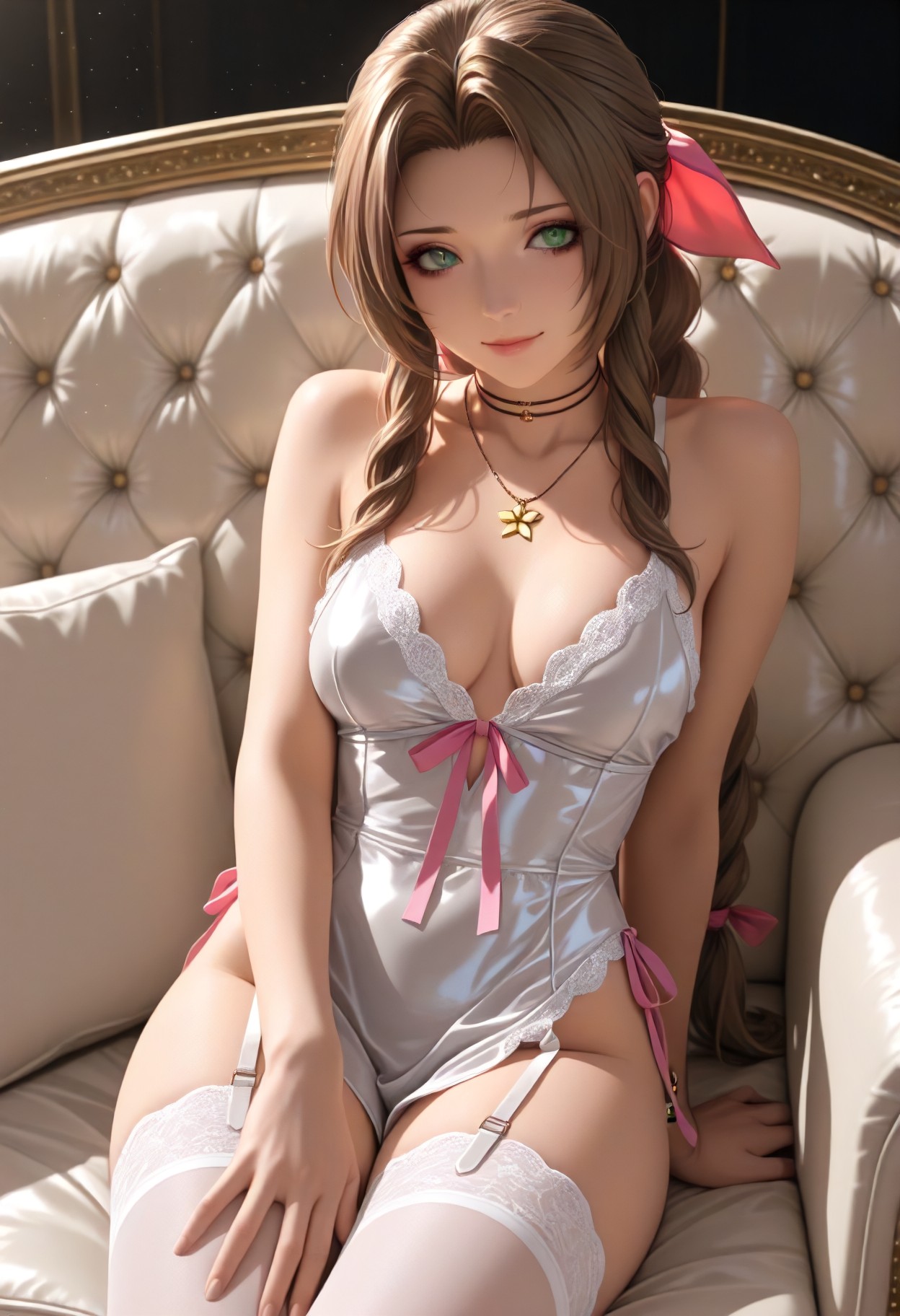 1girl sitting on white leather couch,wearing semi-transparent white nightie,matching stockings,hand on thigh,dim warm light,straddled over lap,solo,close-up front view,