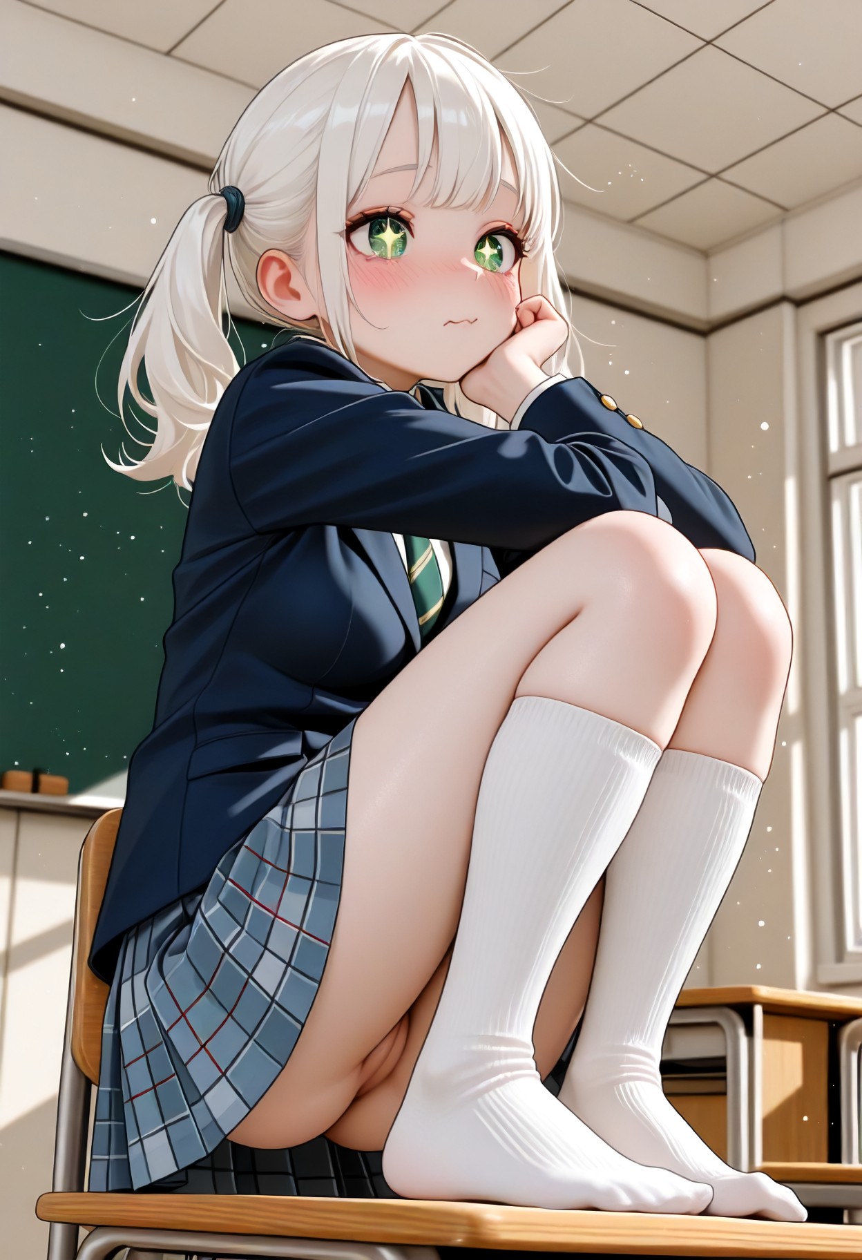 1girl,solo,school uniform,skirt,blazer,tie,knee-high socks,light makeup,soft blush,naked pussy,crouched position,knees together,chin supported,elbows on knees,low angle,full body,pussy visible,side view,classroom,school_room,sad,sad eyes,slight frown,emotional expression,