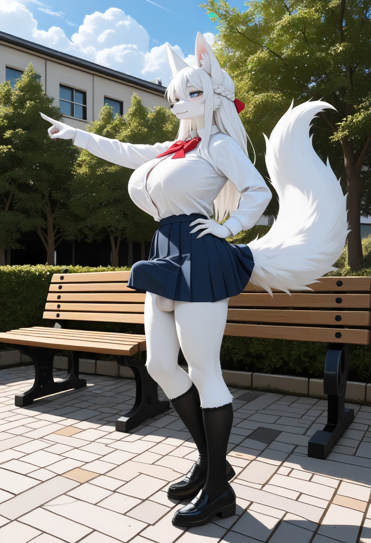 futa,standing,fox tail,school courtyard,pointing finger,scolding,blue pleated skirt,hand on hip,black knee-high socks,white shirt,red bow,black shoes,amber eyes,wooden bench,trees,blue sky,clouds,solo,eye contact