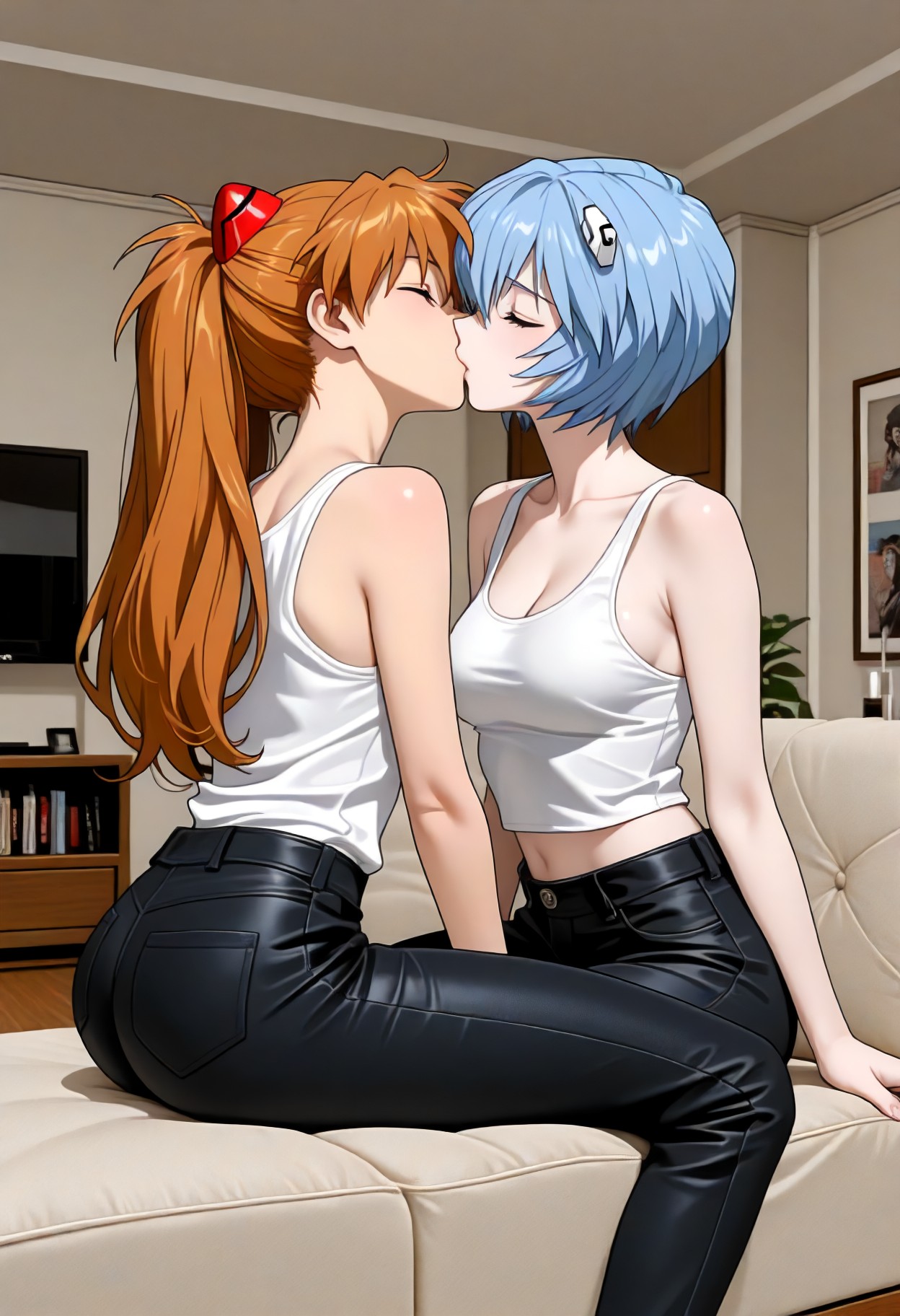 2girls,kissing,tank top,black jeans,ponytail,swaying,eyes closed,intimate,living room