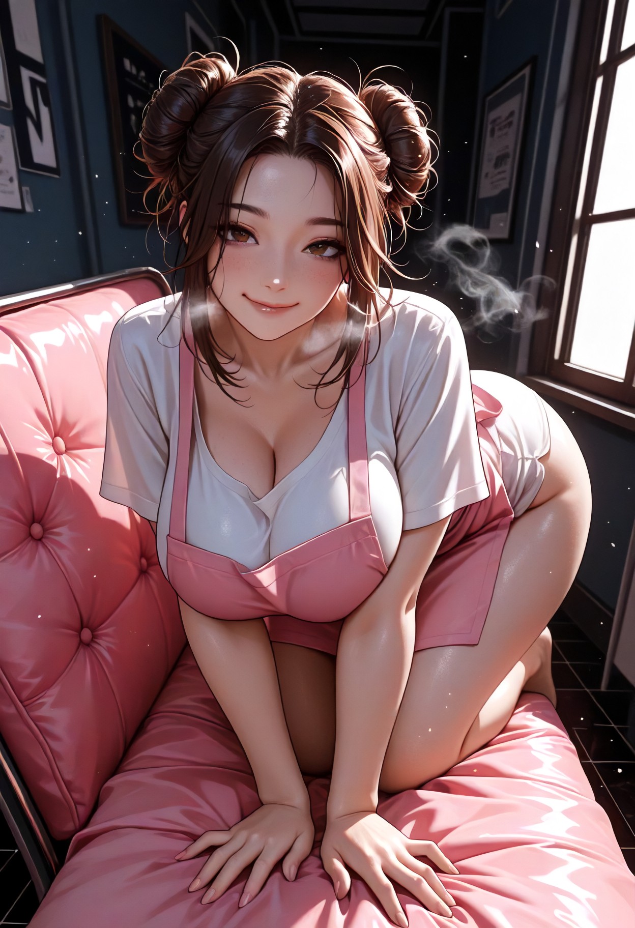 Sfw, Leaning Forward, White Tight Fitting Hospital Gown With A Pink Apron On Top, Solo | Porn AI Maker | MyBabes.AI